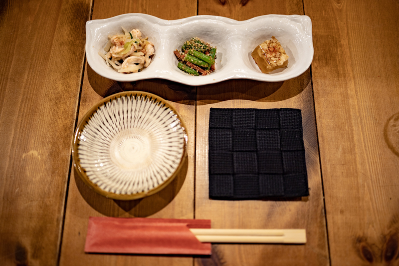 平日だったせいか先客は誰もおらず、通されたカウンターに座ります。メニューに赤星がありますね!これは良いお店かも…。早速オーダーすることにします。日本酒メニューなどを眺めているうちにお通しが提供されました。煮凝りとはなかなか。他の二品もお酒のアテにバッチリ合いそうです。