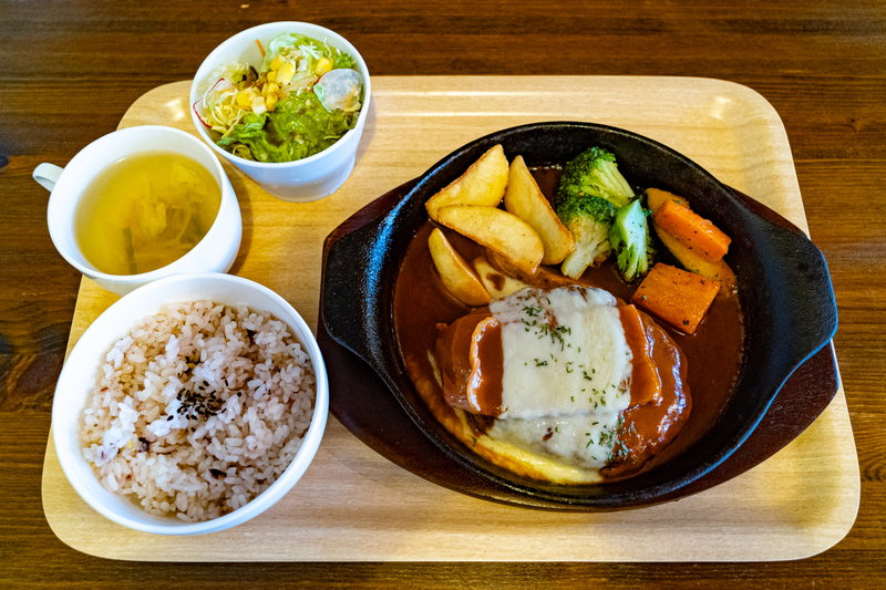 メインディッシュのハンバーグは、お箸で切れる柔らかさでした。デミグラスソースは少しトマト系の風味が出ていました。ベーコンは市販品を乗せただけで、正直いらなかったかな。チーズも溶けるチーズを切って乗せれば…。乱暴な言い方をすれば、市販品を組み合わせて出せる味だと思いました。
