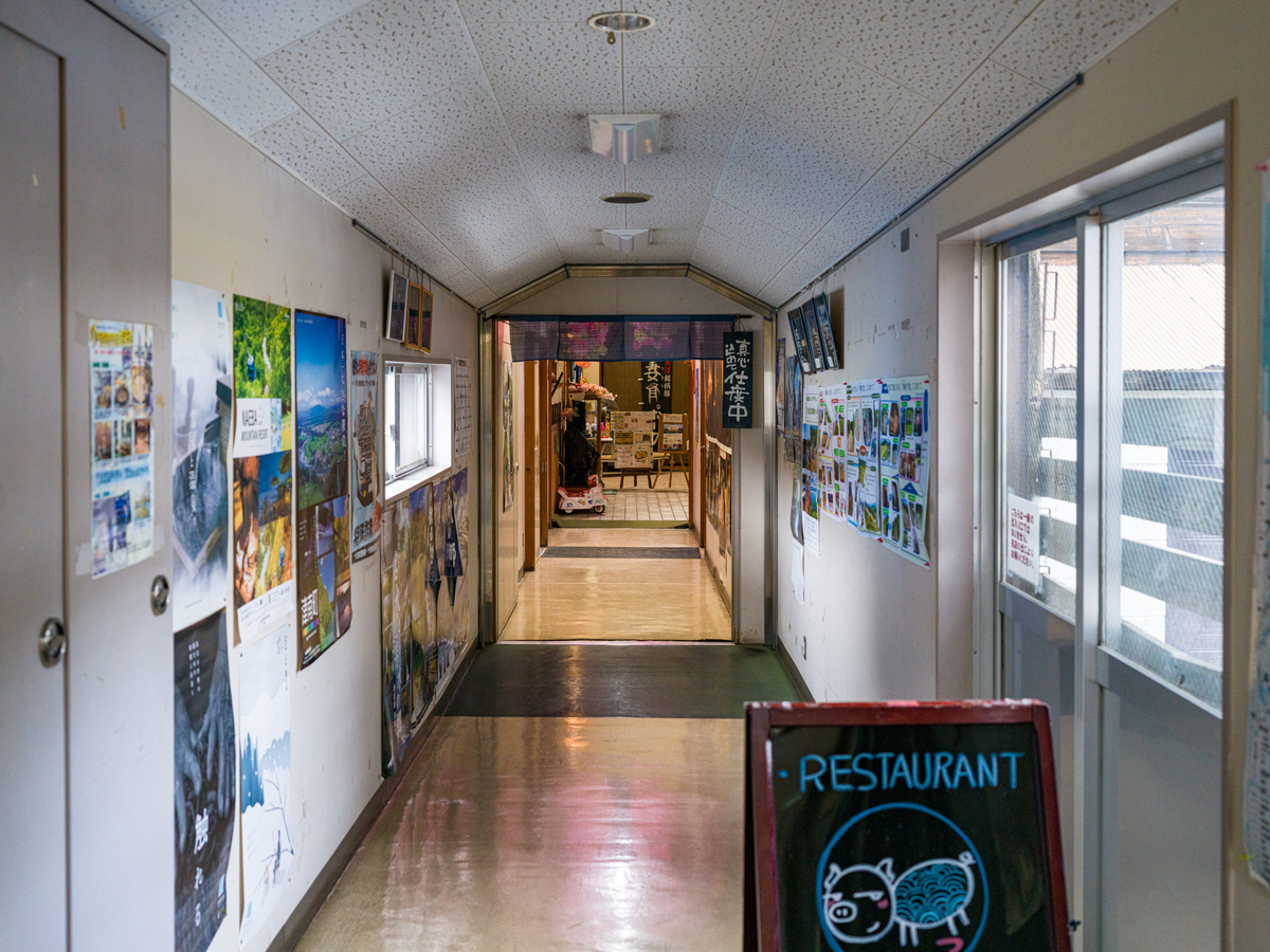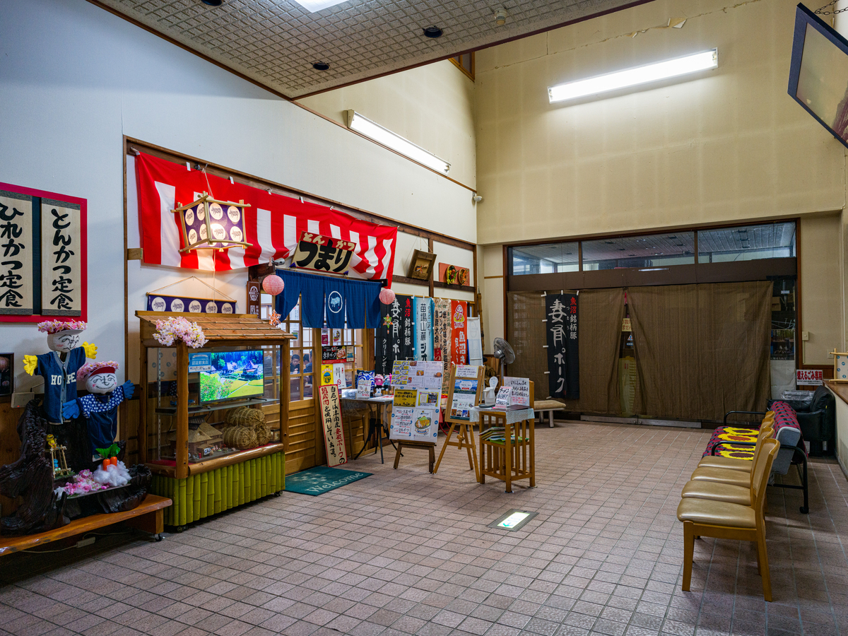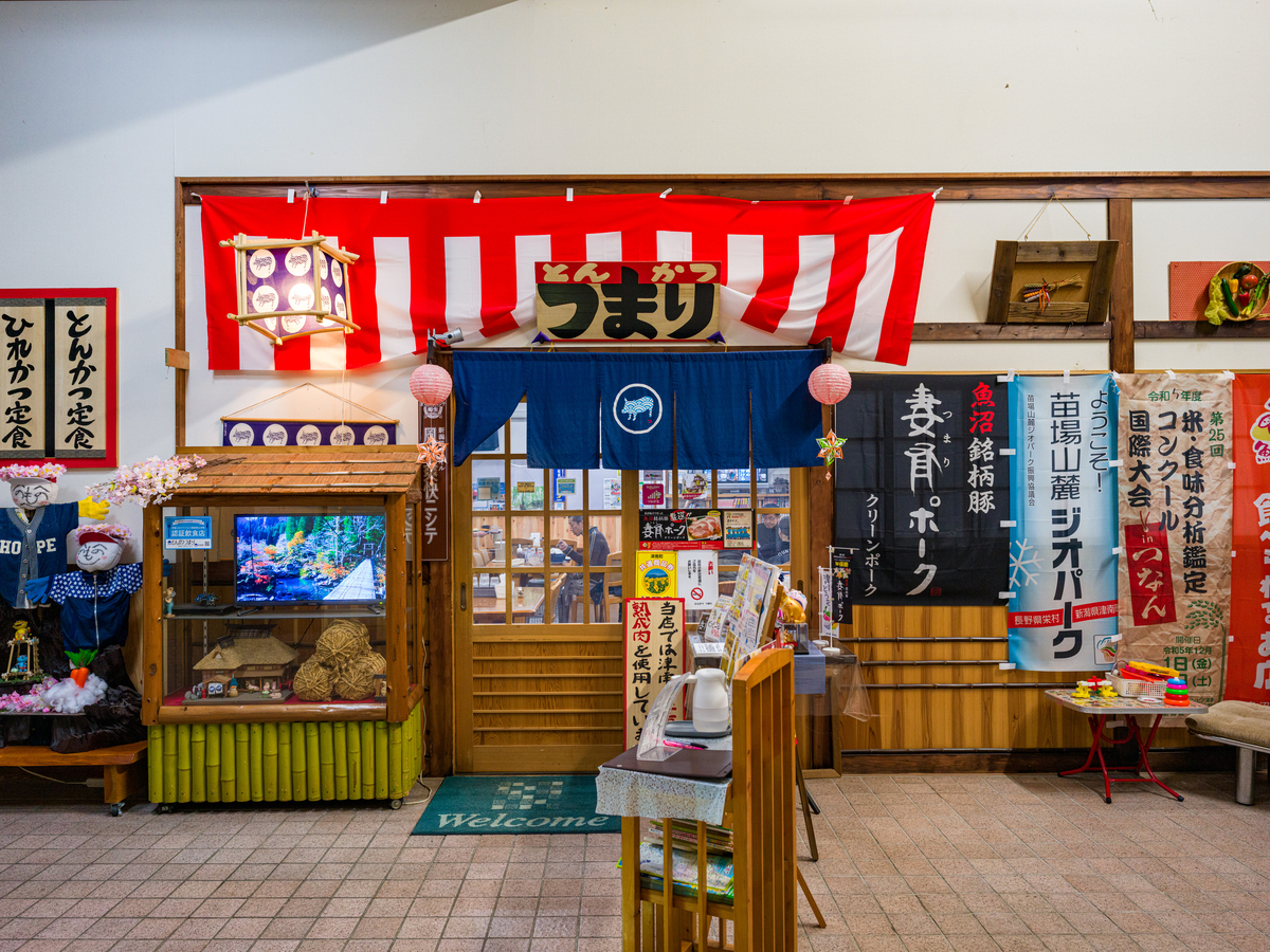 雪を落としやすい形状の屋根になってますね。さすが雪深さを誇る町・津南。写真では左側に「とんかつ つまり」の看板がありますが、お店の位置自体は真ん中の入り口から入って右手奥(上の写真で見ると「魚沼産コシヒカリ 精米 販売」て書いてある方のさらに奥)にあります。看板の位置、入れ替えれば良いのに。